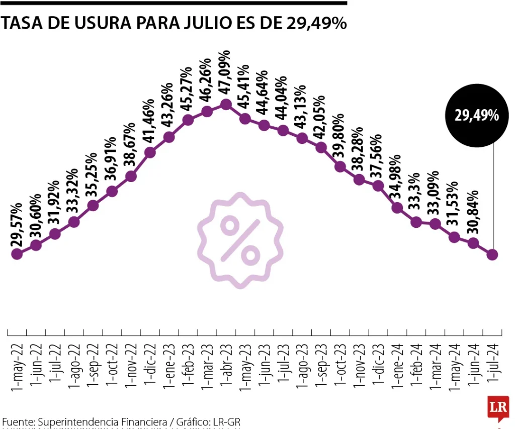 Según la Superfinanciera, este indicador para julio será del 29,49%, lo que representa una disminución en comparación con la tasa de usura de julio, que se ubicó en 30,84%.